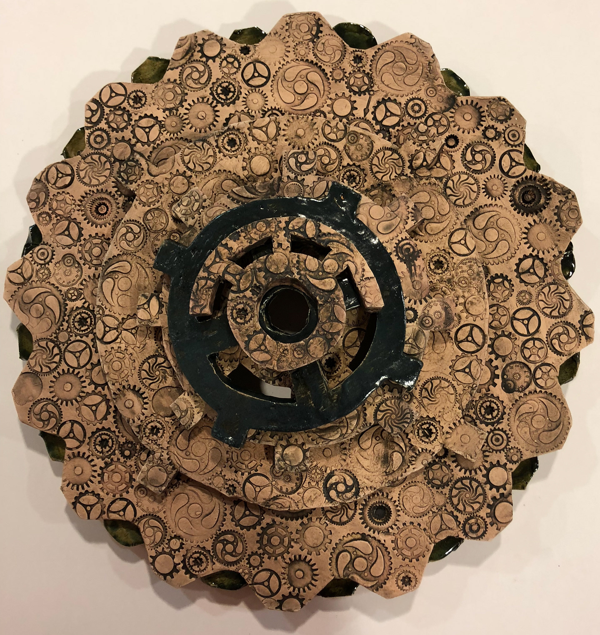 Cogs were cut out and fired at 1100 degrees celsius, and coated with a mixture of glazes, including copper oxide, cobalt red iron, and lithium. The cogs were arranged in a collage of options before a final selection was made.